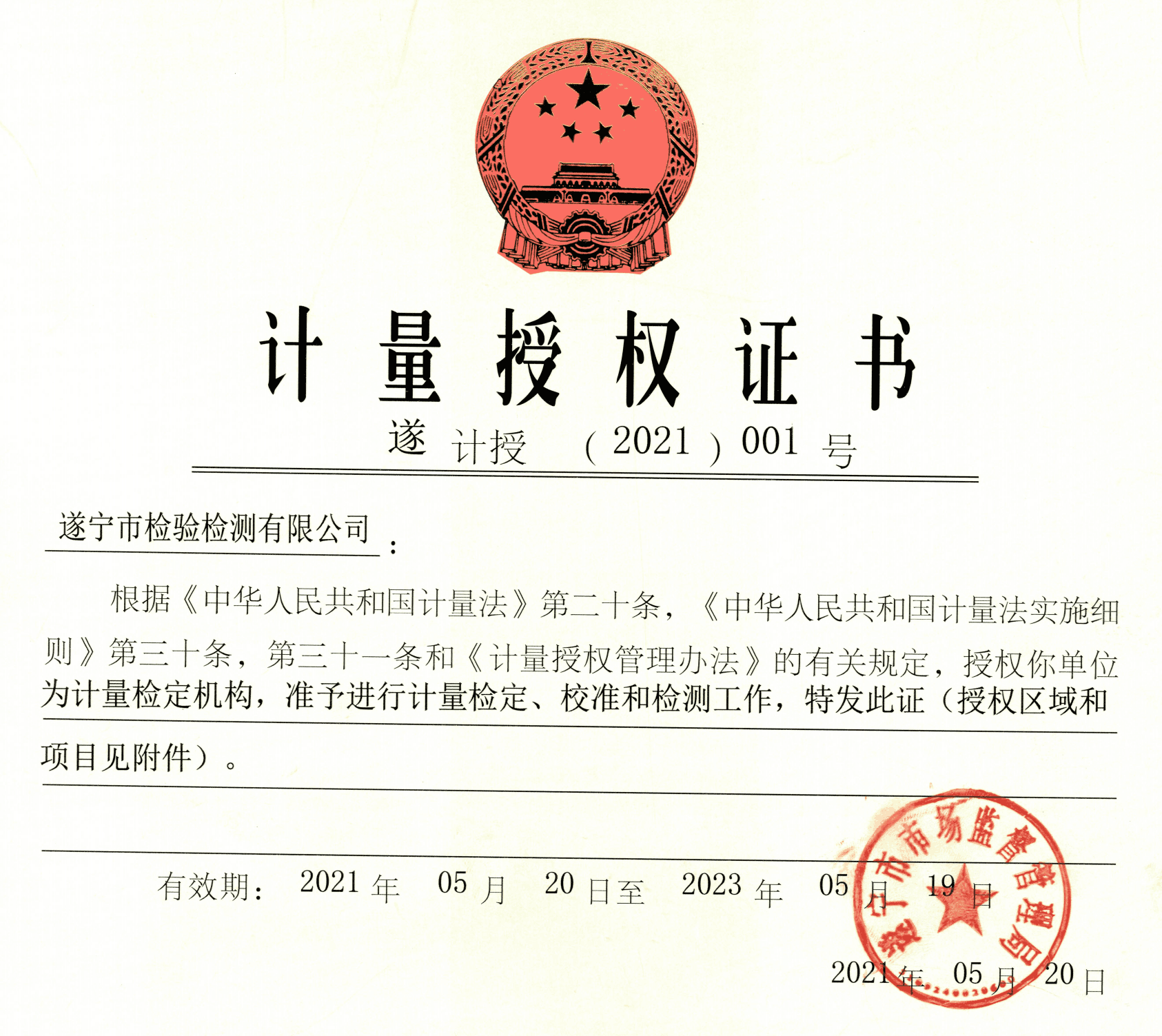 ? ? 近日,遂寧興業(yè)集團(tuán)直屬企業(yè)市檢驗檢測公司計量檢測中心順利通過遂寧市市場監(jiān)督管理局計量建標(biāo)授權(quán)考核,成功取得計量授權(quán)證書。